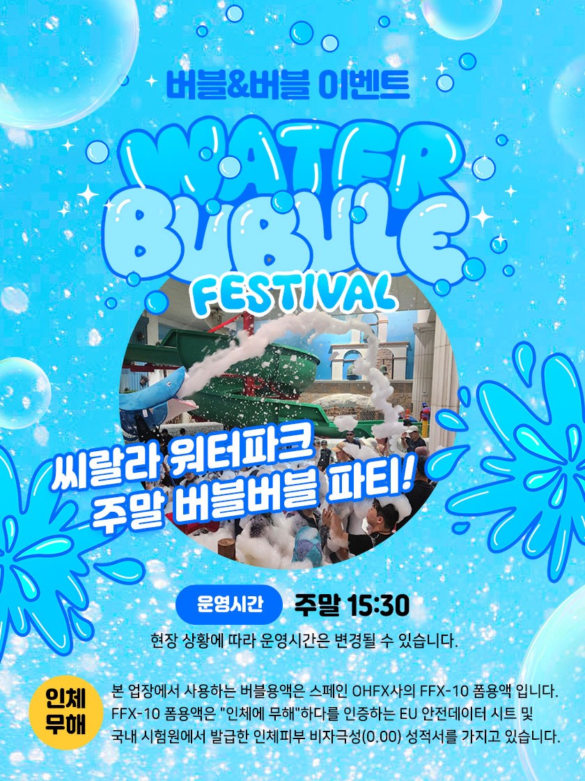워터파크 버블버블 이벤트 웹관리자 작성일2025.08.18 16:48 조회수3412 씨랄라워터파크 버블&버블 이벤트[운영시간]주말 15:30※ 현장 상황에 따라 운영시간은 변경될 수 있습니다.[버블용액 안내]본 업장에서 사용하는 버블용액은 스페인 OHFX사의 FFX-10 폼용액 입니다.FFX-10 폼용액은 "인체에 무해"하다를 인증하는 EU 안전데이터 시트 및 국내 시험원에서 발급한 인체피부 비자극성(0.00) 성적서를 가지고 있습니다. 목록 이전글 2025년 6월 씨랄라 추첨 이벤트 당첨자 공지 다음글 2025년 5월 씨랄라 추첨 이벤트 당첨자 공지